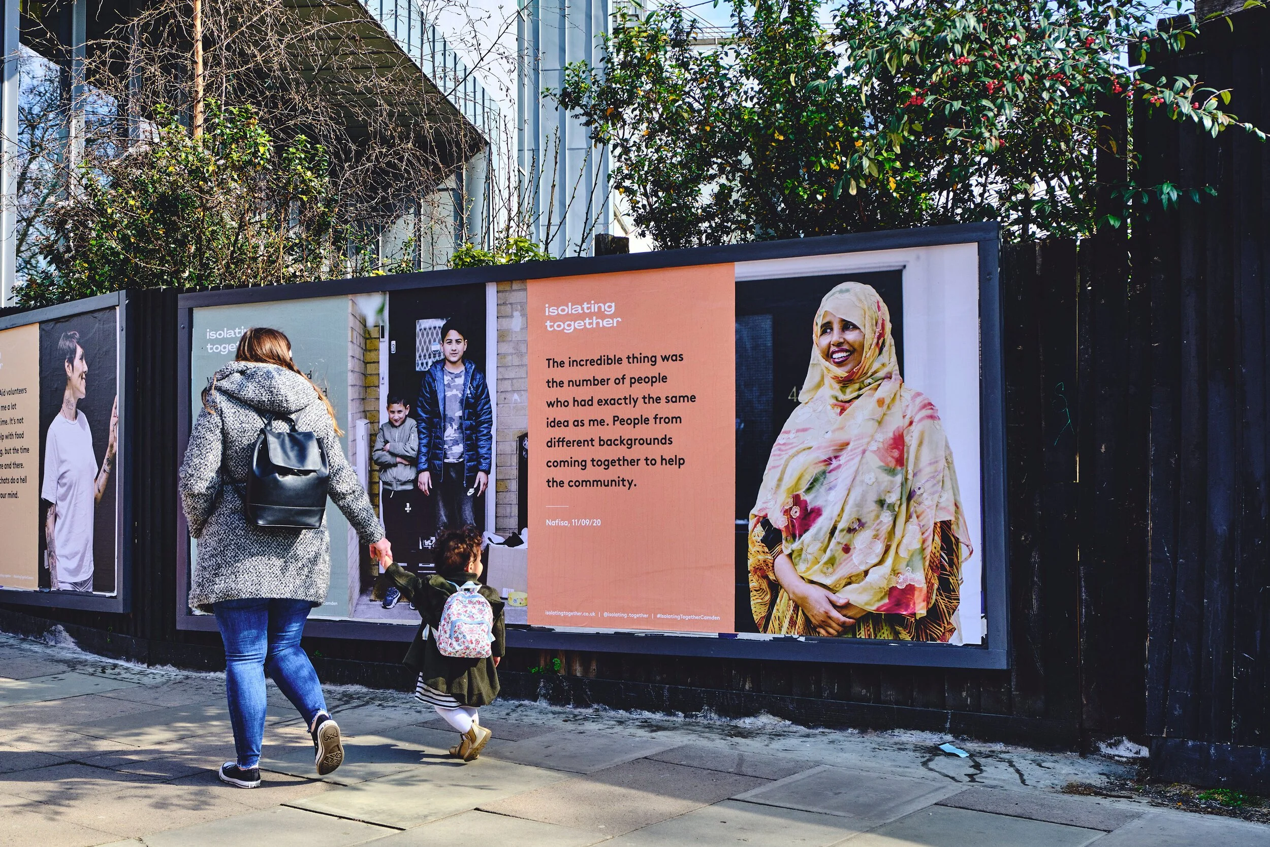 Isolating Together is a photographic project that showcases the faces and stories of Camden residents who came together during COVID lockdown. These stories were then developed into a large-scale outdoor exhibition in celebration of community. In reflecting individual stories back to the community through the exhibition, it gave residents something to be proud of and a space to reflect on what isolation and community support has meant.